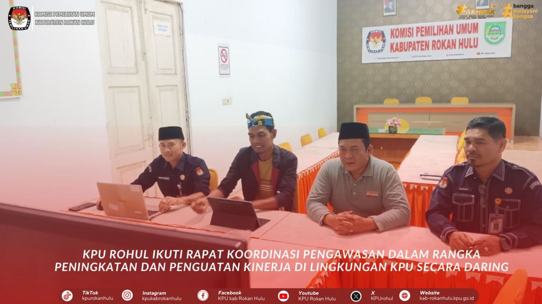 KPU Rohul Ikuti Rapat Koordinasi Pengawasan Dalam Rangka Peningkatan Dan Penguatan Kinerja Di Lingkungan KPU Secara Daring (21/10/2025). Acara diikuti oleh Ketua KPU Rohul Cepi Abdul Husen, Anggota KPU Rohul Rahmat Syah dan Sekretaris Risman Dianto dan jajaran sekretariat.