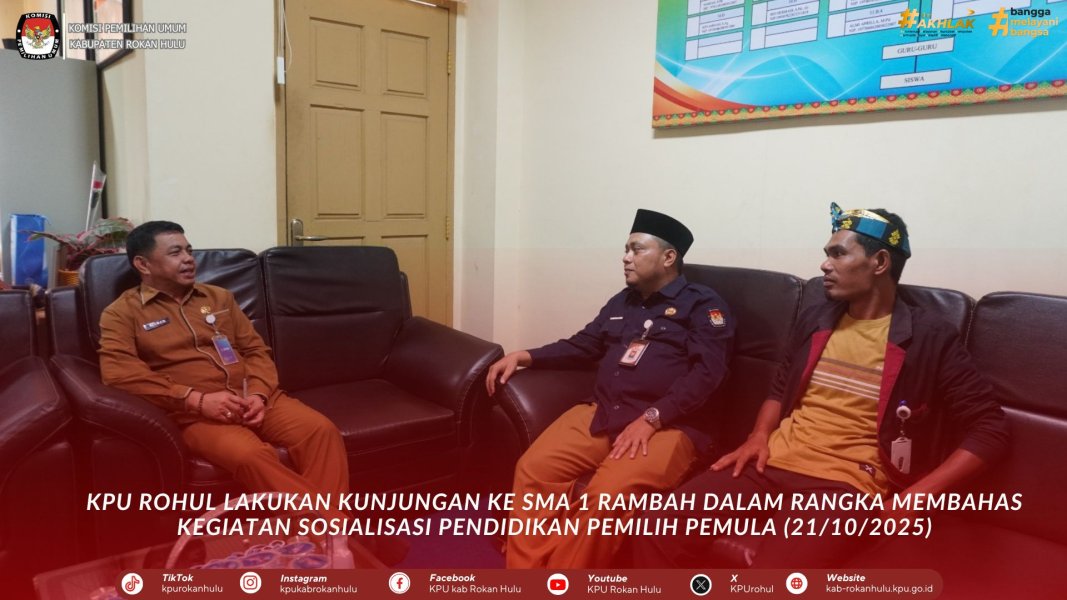 KPU Rohul Lakukan Kunjungan Ke SMA 1 Rambah Dalam Rangka Membahas Kegiatan Sosialisasi Pendidikan Pemilih Pemula (21/10/2025). Kegiatan ini diwakili Anggota KPU Rokan Hulu Rahmat Syah dan Jajaran Sekretariat. Kegiatan ini disambut oleh Kepala Sekolah SMA 1 Rambah Bapak Kisman. Hasil dari kunjungan ini akan direncanakan kegiatan sosialisasi pendidikan pemilih Pemula pada waktu yang akan datang bertempat di SMA 1 Rambah Pasir Pengaraian.