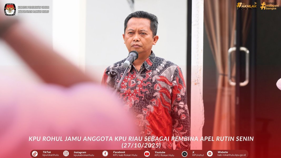 KPU Rohul Jamu Anggota KPU Riau Sebagai Pembina Apel Rutin Senin yakni Nugroho Noto Susanto (Komisioner KPU Riau Divisi SDM dan Parmas) pada 27 Oktober 2025.