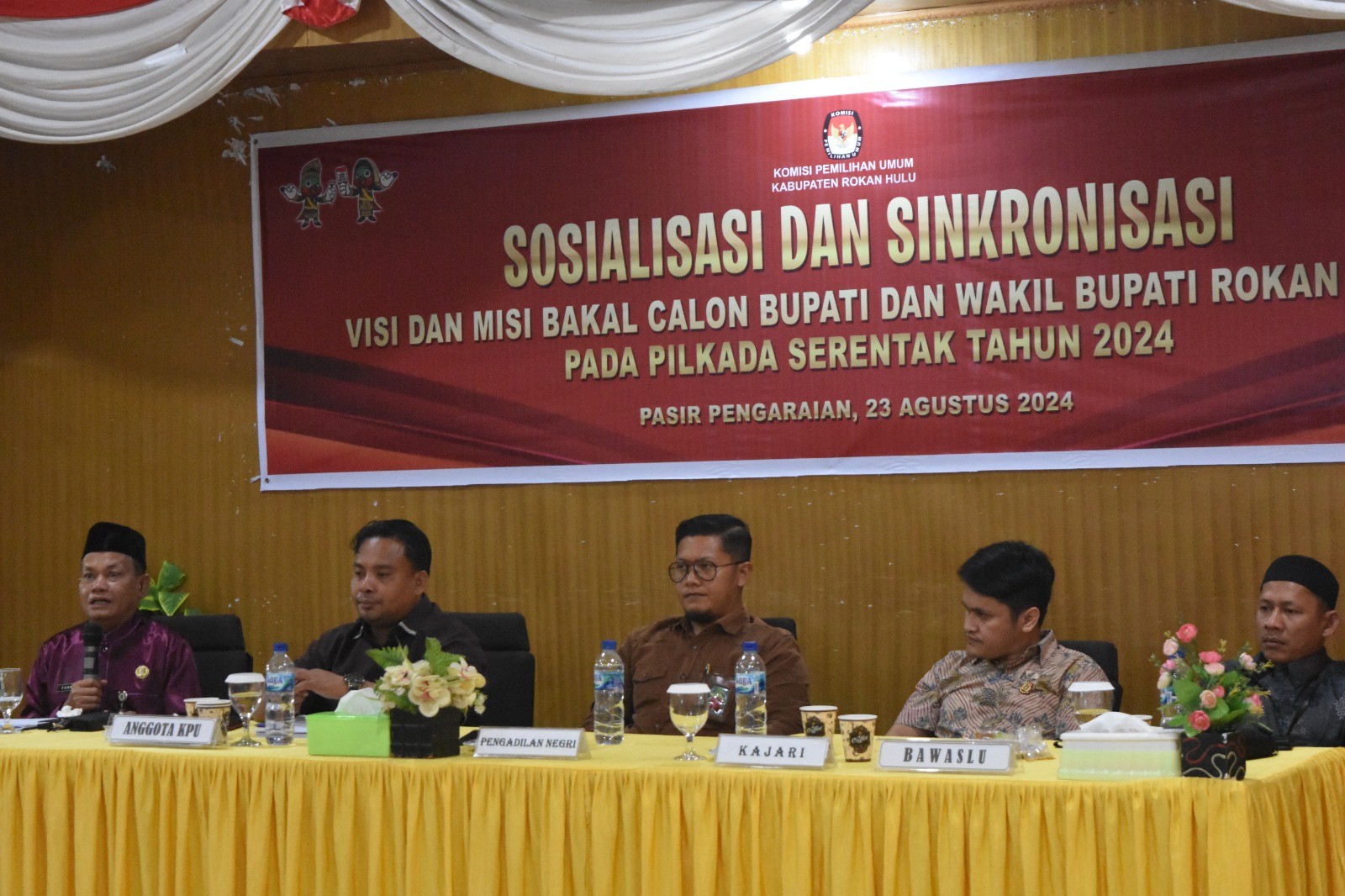 Pasir Pengaraian, http://kab-rokanhulu.kpu.go.id/ - Dalam memastikan visi misi bakal calon Bupati dan Wakil Bupati Rokan Hulu harus sesuai dengan Rencana Jangka Panjang Daerah KPU Kabupaten Rokan Hulu taja Sosialisasi dan Singkronisasi Visi misi Bakal Calon Bupati dan Wakil Bupati Rokan Hulu Pada Pilkada Serentah Tahun 2024, Gelora Bhakti Hotel, Selasa (23/8/2024).