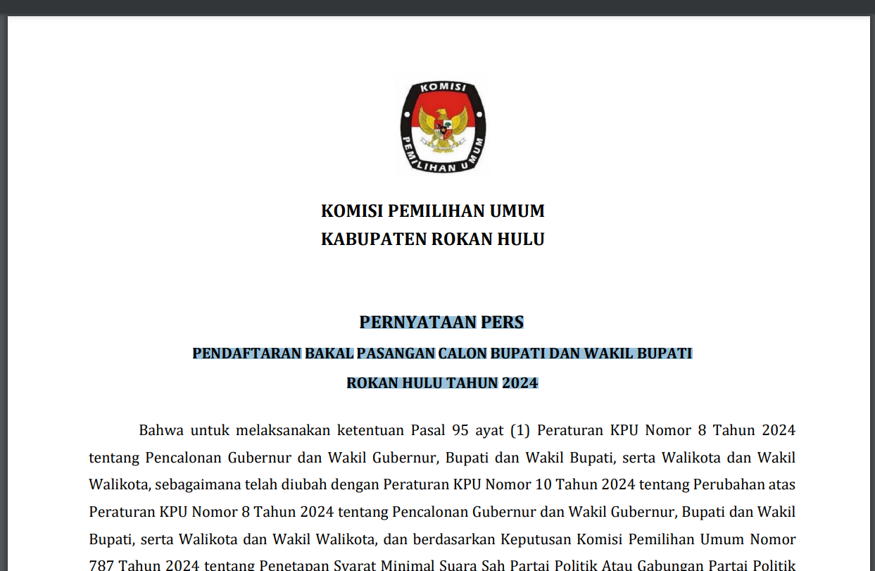 Penerimaan pendaftaran Bakal Pasangan Calon Bupati dan Wakil Bupati Rokan Hulu untuk tanggal 29 Agustus 2024, KPU Rokan Hulu di datangi oleh 4 Bakal Pasangan Calon.