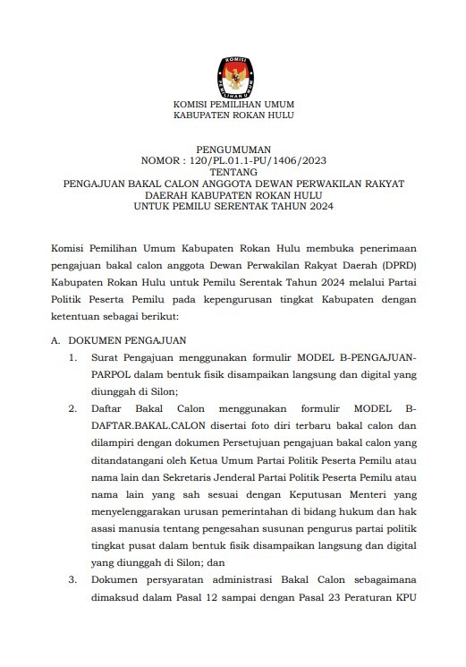 INFO SELENGKAPNYA [https://kab-rokanhulu.kpu.go.id/public/kab-rokanhulu/dmdocument/1682301937PENGUMUMAN%20PENGAJUAN%20BAKAL%20CALON%20DPRD%20ROHUL%20ok.pdf]