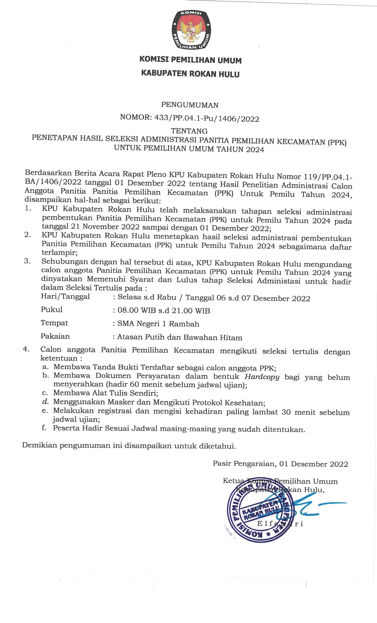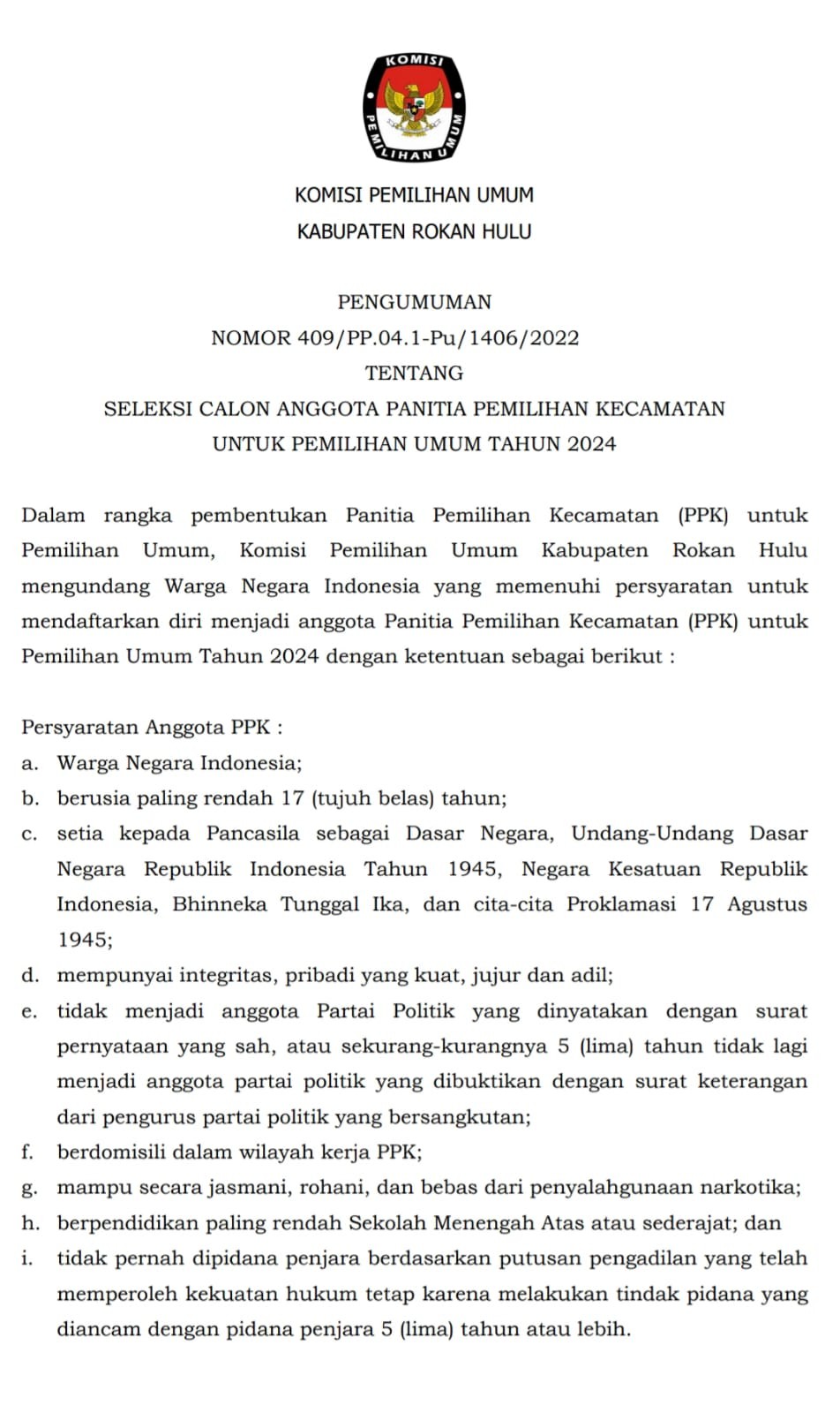 PENGUMUMAN NOMOR : 76/SDM.02-Pu/1406/2023 TENTANG PERPANJANGAN PENDAFTARAN TENAGA PENDUKUNG ADMINISTRASI SEKRETARIAT PANITIA PEMILIHAN KECAMATAN (PPK) KECAMATAN TAMBUSAI, KEPENUHAN, KUNTO DARUSSALAM, BANGUN PURBA, PAGARAN TAPAH DARUSSALAM, BONAI DARUSSALAM DI LINGKUNGAN SEKRETARIAT KOMISI PEMILIHAN UMUM KABUPATEN ROKAN HULU TAHUN 2023 Panitia Seleksi Tenaga Pendukung Administrasi di Lingkungan Komisi Pemilihan Umum Kabupaten Rokan Hulu memberi kesempatan kepada putra-putri terbaik bangsa untuk menjadi Tenaga Pendukung Administrasi Sekretariat Panitia Pemilihan Kecamatan (PPK) Tambusai, Kecamatan Kepenuhan, Kec. Kunto Darussalam, Kec. Bangun Purba, Kec. Pagaran Tapah Darussalam, Kec. Bonai Darussalam di lingkungan Sekretariat Kabupaten Rokan Hulu Tahun Anggaran 2023, dengan ketentuan sebagai berikut: PERSYARATAN UMUM : Warga Negara Indonesia; Berdomisili di Wilayah Kecamatan yang akan dilamar (sesuai KTP); Berusia serendah-rendahnya 18 (delapan belas) tahun dan berusia paling tinggi 40 (empat puluh) tahun; Tidak menjadi anggota/pengurus partai politik/terlibat politik praktis; Memiliki kualifikasi Pendidikan sesuai dengan persyaratan jabatan; Sehat jasmasni dan rohani; Berkelakuan baik/tidak pernah dijatuhi hukuman pidana; Tidak pernah diberhentikan dengan tidak hormat sebagai pegawai di suatu instansi, baik instansi pemerintah maupun swasta; Setia kepada Pancasila sebagai dasar Negara, Undang-undang Dasar Negara Republik Indonesia Tahun 1945, Negara Kesatuan Republik Indonesia dan Bhineka Tunggal Ika; Mempunyai integritas, pribadi yang kuat, jujur, adil dan rasa tanggung jawab; Mampu bekerja penuh waktu mengikuti pelaksanaan Tahapan Pemilu dan Pemilihan Serentak Tahun 2024. PERSYARATAN KHUSUS: Memiliki kualifikasi pendidikan dan keahlian sesuai formasi: NO JABATAN KUALIFIKASI JUMLAH FORMASI UNIT KERJA 1. Tenaga Pendukung Administrasi Sekretariat Panitia Pemilihan Kecamatan (PPK) Pendidikan Minimal SMA sederajat; 12 (Dua Belas) orang Masing-masing 2 (Dua) Orang Per Kecamatan 1. Kecamatan Tambusai, 2. Kecamatan Kepenuhan, 3. Kec. Kunto Darussalam, 4. Kec. Bangun Purba 5. Kec. Pagaran Tapah D. 6. Kec. Bonai Darussalam Mampu mengoperasikan komputer - Bersedia Bekerja Penuh Waktu selama Tahapan Pemilu Tidak Terdaftar menjadi Anggota Parpol maupun pendukung Bakal Calon Anggota DPD PERSYARATAN ADMINISTRASI : Surat Lamaran yang ditandatangani oleh pelamar ditujukan kepada Panitia Seleksi Tenaga Pendukung Administrasi dilampiri dengan : Fotocopy ijazah terakhir dan transkrip nilai yang dilegalisir; Fotocopy Kartu Tanda Penduduk (KTP) yang masih berlaku; Pas Photo terakhir berwarna ukuran 4x6 sebanyak 4 lembar; Daftar Riwayat Hidup dengan mencantumkan nomor HP/ Whatsapp aktif dan melampirkan keterangan pendukung (pelatihan, pengalaman kerja, penghargaan, dsb. bila ada); Surat pengalaman kerja bila ada; Surat Keterangan Catatan Kepolisian (SKCK) yang masih berlaku; Dan Surat Keterangan Sehat dari Dokter Pemerintah; Persyaratan angka f dan g dilengkapi setelah dinyatakan lulus seleksi. TATA CARA PENDAFTARAN : Berkas lamaran disampaikan melalui link : https://bit.ly/3Sz40Hu dan hardcopy ditujukan kepada : Sekretaris KPU Kabupaten Rokan Hulu Panitia Pendaftaran Tenaga Pendukung Administrasi Sekretariat PPK Alamat : Kantor Komisi Pemilihan Umum Kabupaten Rokan Hulu Jalan Imam Bonjol Nomor 48 Pasir Pengaraian Berkas Hardcopy Paling lambat diterima 5 Maret 2023 pukul 16.00 WIB. PENGUMUMAN HASIL SELEKSI ADMINISTRASI : Pelamar yang memenuhi syarat administrasi akan diumumkan melalui website KPU Kabupaten Rokan Hulu https://kab-rokanhulu.kpu.go.id/ pada tanggal 5 Maret 2023; Pelamar yang dinyatakan lulus administrasi berhak untuk mengikuti Seleksi Wawancara dan Test Komputer. PELAKSANAAN SELEKSI WAWANCARA : Pelaksanaan Seleksi Wawancara dan Test Komputer akan dilaksanakan di Sekretariat Panitia Pemilihan Kecamatan (PPK) masing-masing pada tanggal 7 s/d 11 Maret 2022 Pukul 09.00 WIB (jadwal seleksi sebagaimana terlampir); Pelamar yang mengikuti Seleksi Wawancara agar hadir 30 menit sebelum dimulai; Pelamar yang mengikuti Seleksi Wawancara menggunakan Kemeja Putih dan Celana/Rok Hitam. PENGUMUMAN HASIL SELEKSI : Pelamar yang LULUS akan diumumkan melalui website KPU Provinsi Riau https://kab-rokanhulu.kpu.go.id/ pada tanggal 13 Maret 2023. KETENTUAN : Pelamar yang dinyatakan lulus diwajibkan daftar ulang konfirmasi kepada Panitia Seleksi, dengan membawa : Surat Keterangan Catatan Kepolisian (SKCK) Surat Keterangan Sehat Jasmani dan Rohani Menyiapkan Materai Rp.10.000,- sebanyak 2 (dua) buah Seluruh lamaran yang masuk pada periode lamaran akan diikutsertakan dalam seleksi administratif. Seluruh tahapan seleksi tidak dipungut biaya apapun. Panitia Seleksi tidak bertanggungjawab atas pungutan atau tawaran berupa apapun oleh oknum-oknum yang mengatasnamakan (Unit Kerja). Keputusan Panitia Seleksi Pengadaan Tenaga Pendukung Sekretariat PPK Tahun Anggaran 2023, bersifat mutlak dan tidak dapat diganggu gugat. Pasir Pengaraian, 03 Maret 2023 Ketua Panitia Seleksi, Ttd Dadang Mashur Lampiran Pengumuman Nomor : 76/SDM.02-Pu/1406/2023 Tanggal : 3 Maret 2023 Tentang : Perpanjangan Pendaftaran Tenaga Pendukung Administrasi Sekretariat Panitia Pemilihan Kecamatan (PPK) di Lingkungan Sekretariat Komisi Pemilihan Umum Kabupaten Rokan Hulu Tahun 2023 JADWAL SELEKSI TENAGA PENDUKUNG ADMINISTRASI SEKRETARIAT PANITIA PEMILIHAN KECAMATAN (PPK) DI LINGKUNGAN SEKRETARIAT KOMISI PEMILIHAN UMUM KABUPATEN ROKAN HULU TAHUN 2023 NO TAHAPAN PELAKSANAAN KETERANGAN 1 Pengumuman 28 Pebruari 2023 1 (satu) hari 2 Pendaftaran 1 s.d 3 Maret 2023 3 (Tiga) hari 3 Perpanjangan Pendaftaran untuk 6 Kecamatan (Kecamatan Tambusai, Kecamatan Kepenuhan, Kec. Kunto Darussalam, Kec. Bangun Purba, Kec. Pagaran Tapah Darussalam, Kec. Bonai Darussalam 4 s.d 5 Maret 2023 2 (Dua) hari 4 Seleksi Administrasi 4 s.d 5 Maret 2023 2 (Dua) hari 5 Pengumuman Hasil Seleksi Administrasi 6 Maret 2023 1 (satu) hari 6 Pelaksanaan Seleksi Wawancara dan Test Komputer 7 s.d 1